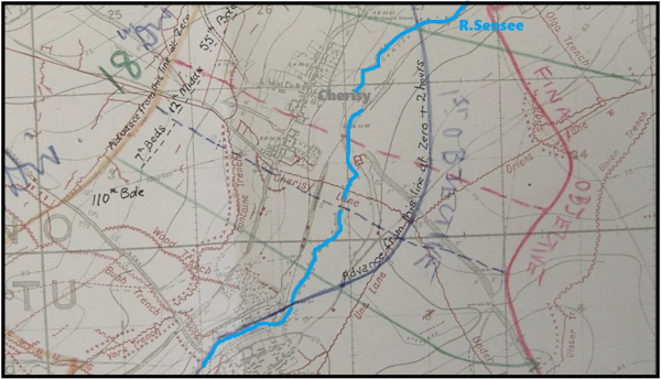 The war diary has:- "1st May - moved to front line before CHERISY VILLAGE, remained during night 1-2. At 3:45 am the battalion attacked CHERISY and FONTAINE trench in front of it, the first objective being the high ground beyond the SENSEE stream, the second being the high ground beyond it. Owing to the darkness the Coys immediately lost touch with their flanking troops and went on on their own. "C" and "D" Coys.,(L and R leading Coys) were followed by "A" and "B" in support. Soon after the start the 7th Bedford (on R of "D" Coy., and 1 platoon of "B" came back to the front line. This was due to someone on the right having shouted "retire" and at the same time a tank came beck from the direction of Bosch line. All were sent back, except the "B" Coy., who were kept in Reserve in case of severe counter-attack on our front line. The BED and "D" Coy had now however lost the barrage and took up a line in front of FONTAINE Trench (about 200 yards SE of CHERISY VILLAGE). The 2 left Coys had kept their direction and formed a line along bank of SENSEE Stream. "A" could not get beyond the village and established themselves in ruins there, establishing a strong point at S end of village. This consisted of 50 men, eventually reduced to 8 and a Sergt of whom 5 and the Sergt eventually got back. The 11th R FUSILIWERS were now ordered to reinforce but owing top heavy fire could not get across the open. The Bedfords were said to be in FONTAINE trench and wood (SE of it) A message came back from "C" Coy about this time by Pte FOX (who had come the whole way under heavy fire) "C" Coy were holding back in O.33.a and were in touch with 7th Buffs on the left and "A" Coy on R. Now another message came from OC Beds denied that his men were in FONTAINE Trench The 55th Brigade (on our left) now came streaming back on their own and Col.Johnston stopped 300 or 400 of them and they packed into our front line trench. Our men and the Beds, seeing what had occurred also began to fall back. All these troops were then sorted out and sent back to their sectors by Col.Johnston and the line was held., Fusiliers on the left, Middlesex on right, BED beyond latter assisted by a Coy of Northants. Another Coy of Northants were placed in support trench in reserve. "A" Coy were now the only troops in front and they were still holding out in the village. These were gradually reduced however and finally the remnants got back. "A" and "C" put up a splendid fight and used their rifles with great effect. Of the survivors none had fired less than 60 rounds, some between 150 to 200 rounds. All officers, both C.S.M.s and all N.C.O. except Sgt WHALE in charge of strong-point mentioned above, were casualties. At night the NORTHANTS attacked again and during the attack many men of "B" and "D" Coys in the shell holes joined them and returned with them. Officers- 6 killed, 3 wounded, four missing, 1 captured. O.R. 19 killed, 111 wounded, 173 missing" CWGC, with of course access to later figures regarding missing, has 111 (all ranks) killed and not one man has an identified grave. trench map above, disputed area O.33.a. below photo: Commonwealth War Graves Commission click here to go to the Commonwealth War Graves Commission website for full cemetery/memorial details |