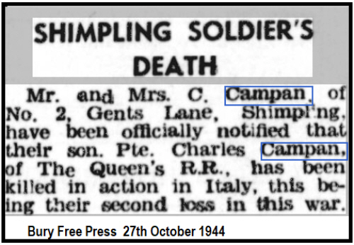 Charles Ernest Campan was born on 18th February 1915 in Shimpling (1st qtr 1915 Sudbury 4a:1739) son of Charles and Ruth (née MORTLOCK)