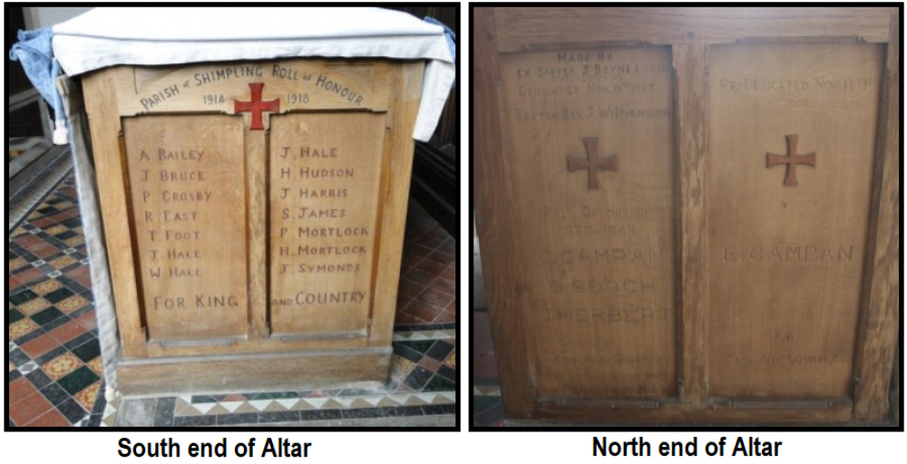 The ends of the altar in St George's Shimpling are inscribed as the war memorials. Carved by Mr.Boynes and dedicated on 11th November 1937 by the Rev. J.Williamson. It was re-dedicated on 11th November 2007.