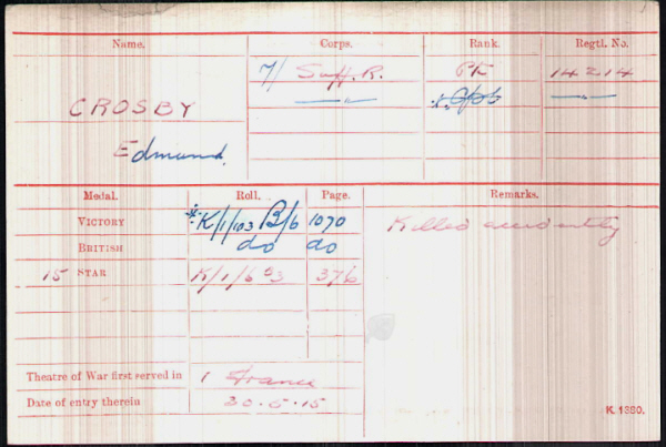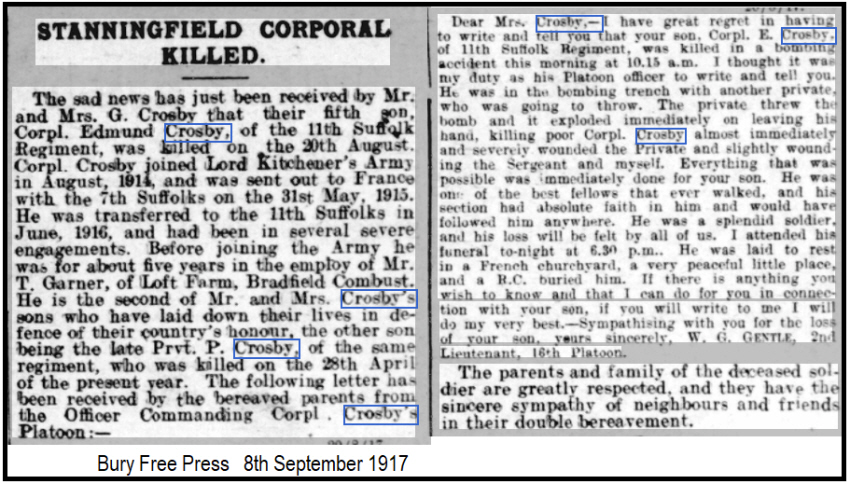Edmund Crosby was born in Stanningfield (2nd qtr 1889 Thingoe 4a:719) son of George and Margaret CROSBY (née GOOCH )