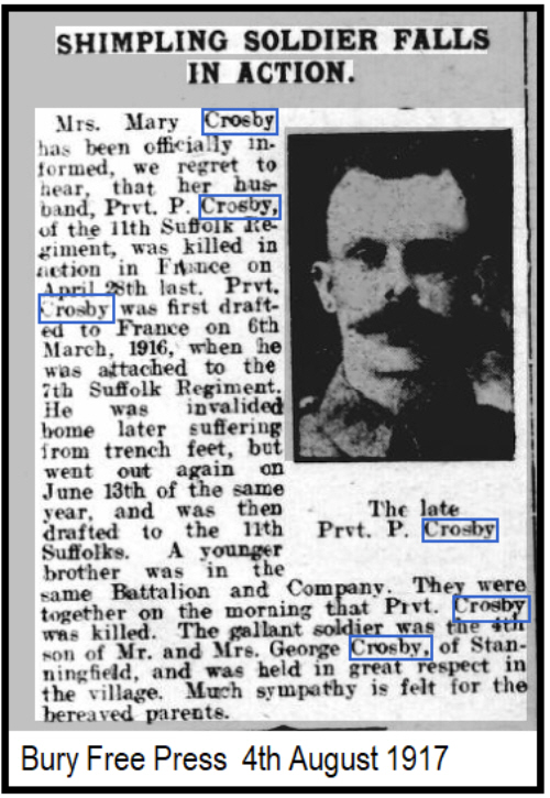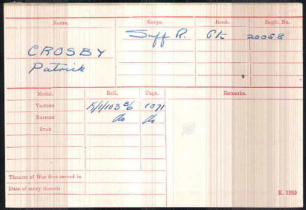 Patrick Crosby was born in Stanningfield (3rd qtr 1886 Thingoe 4a:676), son of George and Margaret CROSBY (née GOOCH )