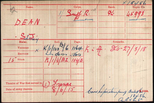 He enlisted in Newmarket. On the 26th March 1918 the 7th Suffolks were taking up defensive positions in the Albert bridgehead that they had themselves prepared 2 years earlier. With their backs to the wall, they were striving, without artillery support, bombs, rifle grenades or trench mortars, to stem the onrush of the overwhelming numbers of the enemy. They had left billets in Albert and by 15:00 had dug themselves in along the railway, their left resting on Albert station and the right 300 yards south of the Albert-Amiens road. At 16:30 they saw waves of Germans advancing towards Albert and around 17:30 the enemy were seen marching along the Albert-Millencourt road. Here the Suffolks, with a Lewis gun, inflicted heavy casualties but the gun was soon put out of action. Attacks along the railway line were twice driven off . At 22.20 the Germans attacked in great strength and the bridgehead was lost.. At 23:15 a counter attack was attempted by the remnants of 2 Platoon together with some from the 5th Northants. Shortage of ammunition doomed this to failure. The line was then withdrawn 300 yards and stabilised. By the time the battalion was relieved on the 28th and the roll taken, they had suffered 256 casualties, one platoon had been reduced to three men. Unusually for a war diary, all the other rank casualties, killed and wounded, are named in each Company, but Sidney's name does not appear, unless he is entered as 45913 Dean E. of "D" Company. The action was such that date of death could not accurately be recorded. He fell with Charles Hunt click here