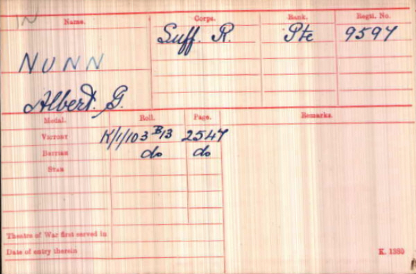 Albert George Nunn was born in Stowlangtoft (3rd qtr 1897 Stow 4a:842), son of Alfred and Emma NUNN(née SAVAGE).