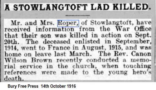 1901 census...Aged 4, he was at Long Green, Great Bardfield, Essex with his father Henry ROPER [37] shepherd born Otley; his mother Ellen [36] born Bedfield; sisters Gertrude [12] born Earl Soham, Henrietta [8] and Elsie [6] both born Martlesham and Dora [2] born Stoke by Nayland; brother Alfred [9] born Martlesham. 1911 census...Aged 14, a farm labourer, he was at The Street, Stowlangtoft with his parents; sisters Dora and Annie [4] born Pakenham; brothers Henry Edward [10] born Great Bardfield, Ernest George [7] born Ixworth and William [2] born Ixworth. The pension card has his mother at Stowlangtoft. |