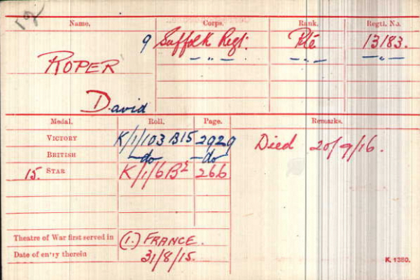 Davy Roper was born in Stoke by Nayland (1st qtr 1897 Sudbury 4a:785), son of Henry and Ellen Rose ROPER (née ROGERS).