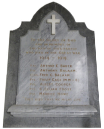 The war memorial for Sapiston consists of a wall mounted plaque in St.Andrew's Church. On the north wall, a shaped light grey marble plaque on a darker grey similarly shaped marble panel. Under a white cross is inscribed in gold lettering:- AND IN MEMORY OF THE MEN OF THIS PARISH WHO DIED IN THE GREAT WAR 1914-1919 PTE. ARTHUR E.BAKER PTE. ANTHONY BALAAM 1ST CPL.FRED G.BALAAM PTE. PHILIP CAGE (M.M.) PTE.ALBERT COOPER PTE.G.ELIJAH FROST PTE.MAURICE HOWE "THEY DIED THAT WE MIGHT LIVE" There is also a framed, glazed list of subscribers to the memorial The Bury Free Press of 18th December 1920 reported:- SAPISTON'S WAR MEMORIAL - Fine Address by Canon Wilson The Parish Church of Sapiston stands in lonely grandeur in the midst of field some quarter-mile from the main portion of the village, the old village which once stood near it having migrated to sites nearer the main roads. Nevertheless, on Sunday afternoon, in spite of heavy snow which made walking difficult, it was filled with a large congregation. The service was of a very special character, being connected with the unveiling of the mural tablet to the memory of the seven men of Sapiston who laid down their lives in the Great War, 1914-1918: Pte. Arthur Baker, Pte. Anthony Balaam, Lce.Cpl. Fred G.Balaam, Pte.Philip Cage (M.M. and B), Pte.Albert Cooper, Pte. G Elijah Frost, Pte.Maurice Howe. Notable amongst them was Pte.Philip Cage, the son of a soldier, who won the Military Medal and the Bar. The tablet on the wall of the nave is of marble, on a black marble slab, with gold lettering and is the work of Mr. A.Hanchett of Bury St.Edmunds.... ex Servicemen mustered in charge of Lt Stiff lined up in the pathway at the church porch to receive the Duke and Duchess of Grafton..... Canon Wilson preached an appropriate sermon from II Tim.iv.7......