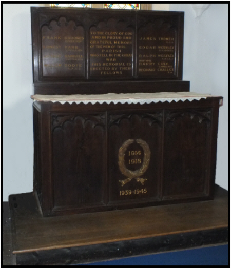TO THE GLORY OF GOD AND IN PROUD AND GRATEFUL MEMORY OF THE MEN OF THIS PARISH WHO FELL IN THE GREAT WAR THIS MEMORIAL IS ERECTED BY THEIR FELLOWS the left hand panel has (with regiment in smaller lettering) FRANK BROOKES SUSSEX REGT. ERNEST PARR SUFFOLK REGT. ARTHUR RANDALL SUFFOLK REGT. WILLIAM ROOTE R.A.S.C. the right hand panel has:- JAMES TURNER R.G.A. EDGAR WESTLEY 9TH LANCERS. RALPH WESTLEY K.O.Y.L.I. 1939-1945 HARRY COLE CAMBS REGT. REGINALD CHALLICE R.A.