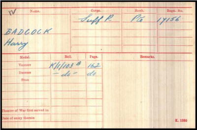 1901 census...Aged 3, he was at Qua Fen, Soham with his father George BADCOCK [38] farm labourer born Burwell; his mother Annie [35] born Soham; brother John [15], Charles 11 and George 10, and sister Annie E, all born in Soham. His mother died in 1907. 1911 census...Aged 13, a farm labourer, he was at Qua Fen Common, Soham with his brother Charles and wife Mary Ann, their daughter Margaret Ivy [1] and un-named son [1 month] and his widower father George (farm ditcher and clayer), and brother Bert [7] born Soham. The family were still at Qua Fen Common in 1919. His elder brother Charles, also in the Suffolk Regiment, died in France in 1918 just after the Armistice. They must have enlisted together since their regimental numbers in the 11th Suffolks were so close together 17156 (Harry), 17153 (Charles). see here |