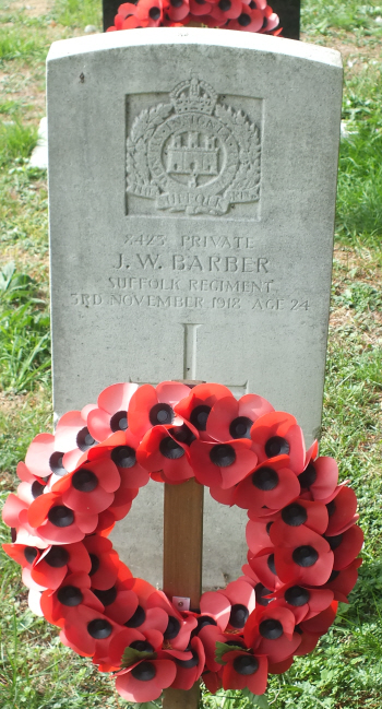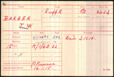 James William Barber was born in Little Downham Fen (Ely Q1-1894 3B:555), on 21st April 1897, baptised in Ely Primitive Methodist Chapel on 20th February 1894, son of Manish (Manasseh) and Sarah Jane BARBER (née CHAPMAN).
