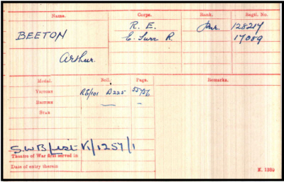 The Special Companies of the Royal Engineers were involved in the British Army's gas warfare operations. Not always popular as they instigated the gas attacks and then withdrew, leaving the retaliatory barrage to fall upon their trench dwelling chums. He enlisted in Newmarket. There is something strange here, he is recorded as 'killed in action' and buried close to the front line and yet his medal index card records a silver war badge ?. He has not been found on any Silver War Badge list. The medal rolls have him as in East Surrey's first, only the medal index card has the reverse. The Special Companies being mobile units, it is next to impossible to say where Arthur was killed, except that it is recorded in the war diary of the 245th Machine Gun Company that the British were using gas on 21st August in the proximity of Mercatel Local press report:- A sharp blow has been unfortunately meted out to Mr.and Mrs.Wm.Beeton, of Leap Year Cottages, Mereside, who received two communications on Sunday morning stating that their second son, Pioneer Arthur Beeton, Royal Engineers, was killed in action on Aug.20th. It will be recalled by our readers that Mr. and Mrs. Beeton's third son, Pte. Elijah Beeton, who was reported missing on July 3rd 1915, has also been now reported as killed in action, on or near that date. The late Pioneer Arthur Beeton, prior to the war, was employed in agricultural work near Downham, Norfolk. He joined the Colours on Dec.7th ,1915, and was in training at Dover until the following February when he was drafted to France. He was home on ten days leave at the beginning of this month, and only returned to France on the 10th, and ten days later was killed. Letters speaking in high praise of the deceased have been received by the bereaved parents from his officers and a fellow comrade from Soham. His Lieut. wrote:-"I fear the news contained in this letter will come as a shock to you. Your son, Pte A.Beeton, was killed on the evening of Aug.20th by a German shell. From the nature of the wounds, death must have been instantaneous. His loss is a blow to all of us, for he was such a willing lad , and one of the best men in the company. We feel that a brother has been taken from us. To you comes the greatest loss of all. May God in his mercy grant you strength and courage in your sorrow. It was the noblest death of all, for he died in helping to defend his country, a task which he had always carried out extremely well. I hope it will be of some comfort to you to know that you have the deepest sympathy of all offers and men in this company". One of his fellow comrades from Soham wrote:-" I am very sorry to have to inform you that your son Arthur was killed in action on the night of Aug.20th. It will come as a great shock to you, especially as it is only a week or two since he was at home. It is also a blow to me, as you know we were the best of pals; a better pal no-one ever had; we were like brothers out here. All the boys of the section express their deep regret, as Arthur was such a favourite with all.He was always cheery, and had won the goodwill of all his comrades."