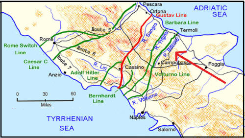 a Gurkha) battalions On 18th October the 17th Indian Brigade relieved a British brigade at Larino, 4 miles SE of the river Biferno (which runs SSE of Termoli on the Adriatic sideof Italy). On the night of the 20th October 2 companies of Royal Fusiliers crossed the river Biferno and seized the high ground north of the river. They spent the next three days working patrols forward towards the river Trigno, only encountering sporadic patrols of the enemy. On the 22nd only Ernest Bridgeman is recorded as dying of the Royal Fusiliers, but it is not currently known if he had been wounded earlier or killed in action that day. It is more than likely he was wounded earlier and died in one of the many hospitals around Bari, since there is a large War Cemetery at Sangro nearer to the action. |