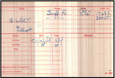 1901 census...Aged 6, he was at Burgess' Corner, Qua Fen, Soham with his father John GILBY [48] farm labourer; his mother Alice [43]; brothers Harry [14] farm labourer and Arthur [12]. All were born in Soham. He had another brother George, a soldier. 1911 census...Aged 16, a farm labourer, he was at Qua Fen Common, Soham with his parents and brother George [27] farm labourer. The pension card has his mother at Loft Cottage, Qua Fen Common. His elder brother George died of his wounds in France in 1914. see here |