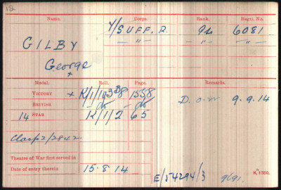 1891 census...Aged 7, he was at Qua Fen Common, Soham with his father John GILBEY [38] farm labourer; his mother Alice [31]; brothers John [10], William [8], Harry [3] and Arthur [1]. All were born Soham 1901 census...Aged 17, he appears to be in prison at Castle Street, Chesterton. There were at least 3 George Gilbey of nearly the same age, but this George was the only one not home for the census. His parents were at Burgess' Corner, Qua Fen, Soham with his brothers Harry [14] farm labourer and Arthur [12] and Elliott [6]. 1911 census...Aged 27, a farm labourer, he was at Qua Fen Common, Soham with his parents and brother Elliott [16] farm labourer. CWGC and pension card have the family at Loft Cottage, Burgess Corner, Soham. His younger brother Elliott was killed in France in 1918 see here |