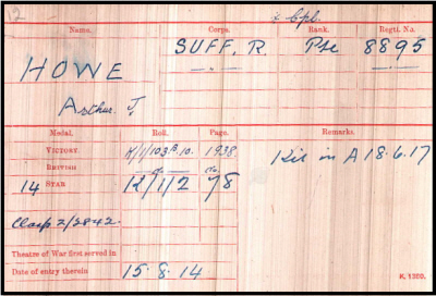 Arthur John Howe was born in Soham on 20th October 1896,(Newmarket Q4-1896 3B:530) baptised in Soham on 13th November 1896, son of John and Kate Sarah HOWE (née MALTON) of Hodge's Hill, Soham