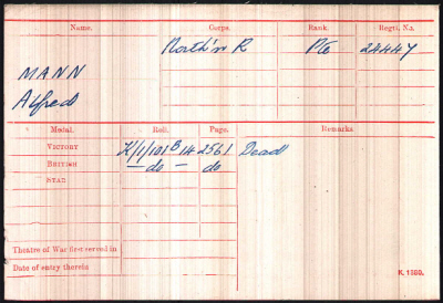 Alfred Mann was born in Soham on 25th December 1892 (Newmarket Q1-1893 3B:514), baptised in Soham on 3rd February 1893, son of Edward and Caroline Agnes MANN (née HAYHOE) of Red Row, Soham.
