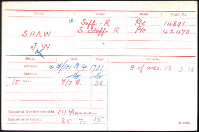 John William Shaw was born in Soham (Newmarket Q2-1895 3B:541), son of Benjamin and Sarah Ann SHAW (née MODEN).
