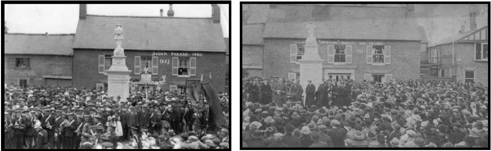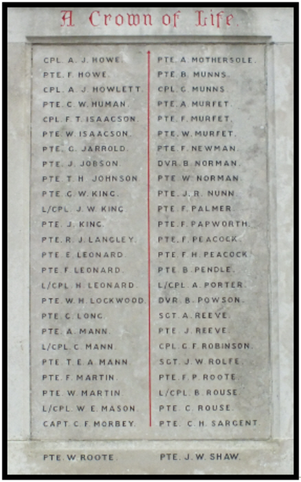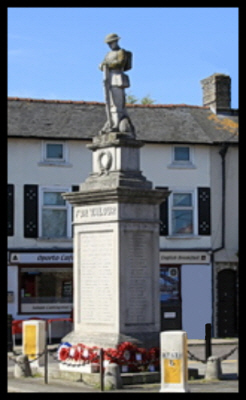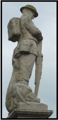 plinth atop large square column set on a two stepped base. The uppermost plinth has a wreath on the front face and King's crown on the rear face. The memorial was unveiled on 23rd January 1921 by Major-General S.W.Hare, K.C.M.G., C.B. The column's panels hold the names of the fallen of the Great War. The forward face has "FOR VALOUR" in relief and similarly on the rear is "PRO PATRIA". Under this, in incised lettering, painted red, and going round the memorial from the LEFT face, "BE THOU" "FAITHFUL UNTO DEATH", "AND I WILL GIVE THEE", "A CROWN OF LIFE". To date no one can explain the significance of the creature depicted around the soldier's feet |