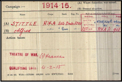 Alfred M. Stittle was born in Soham on 30th December 1884 (Newmarket Q1-1885 3B:588), baptised on 20th February 1885, son of Alfred and Ann Elizabeth STITTLE