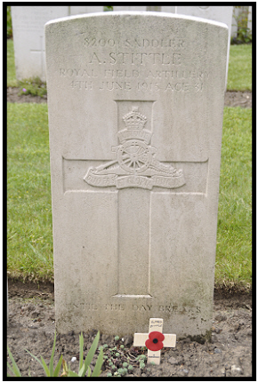 The cemetery was used mainly by No.1 Casualty Clearing Station at Chocques at the time. There is no indication as to when or where he was wounded, but at the start of June 1915 the battery was operating in the Vermelles-Cuinchy area and being shelled in return. The local press report:- FALLEN IN THE FIGHT. SOHAM SOLDIER KILLED The sad news of the death of Bombardier A. Stittle, son of Mr.and Mrs Alfred Stittle. of Hall Street, Soham, was received on Tuesday morning. The deceased had many friends in Soham and district, among whom he was very popular. He was of a particularly cheerful and amiable nature and his kindly smile will be greatly missed by many. The late Bombardier Stittle, who was in his 31st year, enlisted very shortly after the outbreak of war as a gunner and soon afterwards was given a bombardier's stripe. Subsequently he followed his calling as a saddler, earning the title of Bombardier Saddler. He visited his home about December and in January was drafted with a company of fitters and others to France, since which time he has taken part in many of the hottest engagements of the war. The sad news was conveyed to the bereaved parents by the Army Chaplain in the following letter: "I am extremely sorry to tell you that your son, Saddler Bombardier Stittle, R.F.A., died of wounds yesterday at No.1 Casualty Clearing Station. He had been wounded by shrapnel in the head and body and asked me to let you know about him. He did not seem to be very bad when I saw him yesterday morning and I had written a letter to tell you of his wounds, but now I am sorry to say that he has gone. His end was quite peaceful and I do not think he suffered much at the end.Please accept my deepest sympathy in your loss. The wives and mother of England, I fear, are suffering heavily."