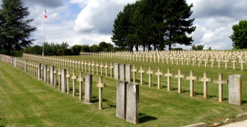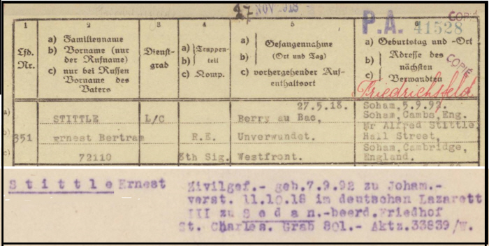 He enlisted in Newmarket. International Red Cross archive have just these records of him firstly being captured, unwounded, at Berry au Bac ( a few miles north of Rheims) on 27th May 1915 and gives his date of birth as 5th September 1892, Next of kin Alfred Stittle of Hall Street, Soham. Then strangely he becomes a civilian prisoner, with a slightly different date of birth, dying on 11th October 1918 in No 3 German Hospital in Sedan and buried in grave 801 in the cemetery of St Charles, which matches closely with CWGC records. Since his Army records have not been found, this is about as accurate as we can be. The Battle of the Aisne was raging just north of Rheims, as the allied with tanks were regaining ground lost to the Germans in the Spring Offensive. From Berry au Bac to Sedan is around 100 Km.