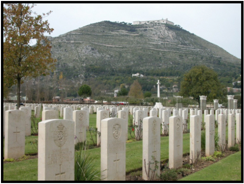 The Royal Hampshire Regiment 1918-1954 by David Scott Danniell page 166. "The Battalion was in the line again on 6th April, once more in a mountain position on the Belvedere feature above Cassino. The Battalion's position was overlooked by the enemy on six-thousand-foot Monte Cairo, and once again all movement had to be made in darkness. the Battalion were in this position for two weeks , under incessant mortar and shell fire." The battalion had two killed that day. Initially buried according to 11GRU/RFW/2116, he was identified by the details on a cross and he was later re-interred at Cassino on 4th January 1945. photo: Commonwealth War Graves Commission click here to go to the Commonwealth War Graves Commission website for full cemetery/memorial details |