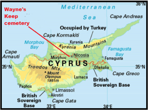 At the time EOKA, (EOKA is the acronym of the organisation's full name in Greek, Ethniki Organosis Kyprion Agoniston (National Organisation of Cypriot Fighters), who were committed to ENOSIS, or Union with Greece. This devolved into armed struggles between the Turkish and Greek Cypriots with the British Armed Forces and their bases as the main target. 371 British servicemen died and 21 British Police officers during the four years of the emergency. Whilst on patrol during Operation 'Lucky Alphonse', on 17th June 1956, where mortars were used in an attempt to flush out terrorists thought to be in the Troodos Mountain Range a forest fire was started. The men became trapped in their vehicles and 21 died. In those days servicemen's bodies were still not repatriated and so Keith was buried in Wayne's Keep military cemetery, which currently is in the UN controlled buffer zone between the Greek and Turkish sectors of Cyprus. As well as his name being added to the village memorial, Keith is named on the Armed Forces memorial (tablet 100) at the National Memorial Arboretum at Alrewas, Staffordshire. The burial took place on 20th June 1956 in a mass grave at Wayne's Keep which is currently in the UN buffer zone between the Turkish and Greek sections of the island and U.N. authorisation is needed for access.