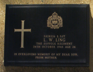Leslie Warner Ling was born on 29th April 1919 (Hackney Q2-1919 1B:450), son of Norman Warner and Eliza Amelia LING (née LING). I have found no trace of a Norman LING, either in births, marriages or deaths, so quite possibly there have been transcription errors or that name was not used. However an Eliza Amelia LING born 22-6-1880 was living at Church Fields, Steeple Bumpstead in the 1939 register but she is recorded as single .The lack of evidence as to a marriage would suggest that this father was Norman WARNER Leaving school he worked on a local farm. He was doing a correspondence course with the view to joining the Metropolitan police. He was also doing boxing training in his spare time and travelled to fairs to take part in boxing tournaments to earn a few shillings. He married Mercy ROBSON (Halstead Q4-1941 4A:2671). Mrs M.LING was at Hall Villas, Helions Bumpstead on the Japanese records. Leslie was the brother in law of Bruce Robson, see here Again, thanks to Ian Robson,his brother in law, for some details and the photo |