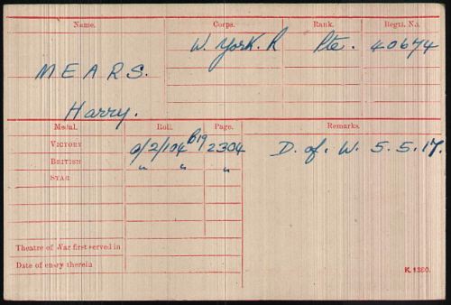 Harry Mears was born in Steeple Bumpstead (Risbridge Q3-1887 4A:615), son of John and Mary Ann MEARS (née COOK).