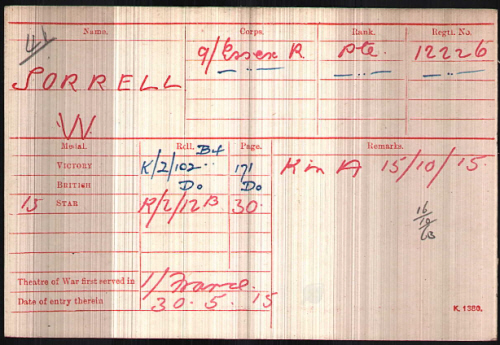 John William Sorrell was born in Steeple Bumpstead (Risbridge Q4-1887 4A:628), son of Thomas and Harriet SORRELL (née BELSHAM). 1891 census...Aged 3, John William was at North Street, Steeple Bumpstead with his father Thomas SORRELL [33] farm labourer; his mother Harriet [28] born Hempstead; sister Mary A [5] and brother Royal E [1]. All except his mother were born in Steeple Bumpstead. 1901 census...Aged 13, stockman, he was at Moyn's Lodge, Steeple Bumpstead with his parents; brothers Ernest[Royal] and Leonard [8] and sister Ida [2]. The new siblings were born in Steeple Bumpstead. His father died in 1903 and in 1908 his mother, with Leonard [14], Ida[9] and Edward [4] sailed on 16th April from Liverpool aboard the SS Dominion for Quebec/Montreal, Canada 1911 census...Aged 23, John William, a milkman, was boarding with widow Sarah MIDSON at North Street, Steeple Bumpstead. |