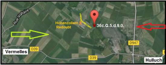 The battalion were fighting around "The Dump". By the 15th they had taken the Hohenzollern Redoubt. The war diary :- 13th..moved into the trench from G.5.d.1.3 to G.5.d.7.0., one company to remain to hold the redoubt at G.5.d.1.3. and trench to G.5.c.8.8. 14th ..This and following 3 days were occupied in consolidating the trenches gained, especially near G.5.d.9.0. A strong point was made by the RE near this point in the angle at the road junction and occupied by us CWGC records the battalion had 2 killed on 15th and 2 more on 16th. |