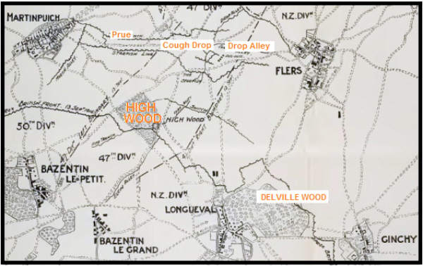 The battalion were at HIGH WOOD, (now known as Bois des Fourcaux) just north of Longueval. It was the scene of some fierce fighting and changed hand several times. The battalion war diary:- "Btn was placed at disposal of 140th Inf Bde and attacked at 9:25 am (Bn less B Coy, but plus a Coy of 22nd London Regt) Distance of advance, 1,500 yards on magnetic bearing of 29m degrees.Left flank directed on COUGH DROP, right flank to pivot on COUGH DROP.The whole Bn to consolidate a line along crest running NE with patrols pushed into EAUCOURT L'ABBAYE. Right Coy to gain touch with 6th Bn London Regt at junction of FLERS LINE and DROP ALLEY, left Coy to endeavour to get into touch with 50th Division in PRUE TRENCH. The right Coy was to push out strong patrols to EAUCOURT L'ABBAYE and the left a strong patrol along the ridge towards 50th Division. No preliminary reconnaissance of ground was made as there was not sufficient time. At 8:55 am the leading platoons extended and moved forward over the crest in line, the other platoons following at proper distance.The Battn reached the crest in 4 waves, followed by bombers, in good order, without casualties. East of HIGH WOOD they were subjected to heavy barrage fire. At 10:25 am reports came back that the attack was going well. Bn was subjected to very heavy machine gun fire on reaching sunken road.After dark patrols were sent out, encountering German posts and patrols and made prisoners, among them an officer.Casualties very heavy, being brought in from neighbourhood of sunken road. At 2 am 17/9/16 the position was handed over to OC 6th Bn London Regt." CWGC records show that only 18 of the battalion's 150 men killed that day have identified grave. |