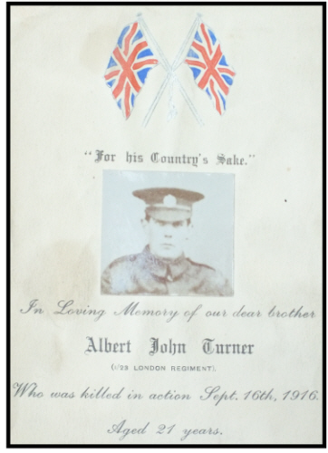 John Albert Turner was born in Steeple Bumpstead (Risbridge Q2-1895 4A:730), son of John and Mary TURNER (née CLAXTON). 1901 census...Aged 6, (entered as William C and altered to John C) he was at Smith's Green, Steeple Bumpstead with his father John TURNER [41] horsekeeper; his mother Mary Ann [38] born Roughton, Norfolk; half brother Sidney H Turner (Claxton) [19] horseman; brothers George W [18] baker's carter, Ernest [14] stockboy, Charles Alfred [11] and William C [2]. All except his mother were born in Steeple Bumpstead. His mother died in 1906 1911 census...Aged 16, John, a farm labourer, was at Smith's Green still with his widower father; brother Ernest, Charles (both farm labourers, and William. Brother George was married and living at the Tanyard, Steeple Bumptead with his wife Kate [22] born Withersfield and their son Percy [11months] born Steeple Bumpstead. His brother George (as next of kin) completed the "Living Relatives" form on 13th May 1919, giving:- parents dead, full brothers George William [36] Tanyard, Steeple Bumpstead Ernest [33] Smith's green, Steeple Bumpstead Charles [29] 32 Ward'sPlace, off Wellgate, Rotherham William [20] 176 Psalters Lane, Holness, Rotherham half brother Sidney Claxton [38] 176 Psalters Lane, Holness, Rotherham |
