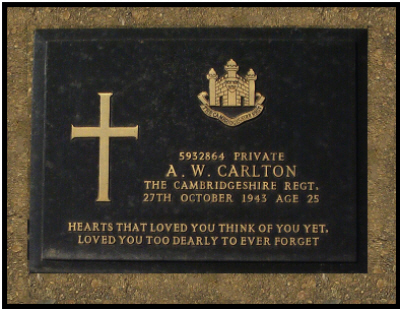 Arthur Carlton was born in 1919 (Newmarket Q1-1919 3B:580), son of Ernest William and Florence Hannah CARLTON (née CROSS ). His uncle Bert Carlton was killed in France in 1916 see here