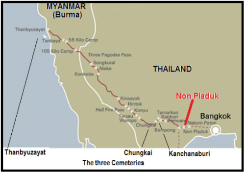 Arthur died from dysentery at Non Pladuk, the southern end of the railway, and originally buried there. He, along with the others, was moved to Chungkai in April 1946.