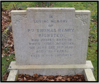 It is not known how he died, nor what medal entitlement he may have had, nor whether he had been wounded or died of illness. He died at White Lodge Hospital, Newmarket.