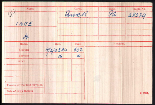 Harry Ince was born in Stoke by Clare on 29th November 1886 (Risbridge Q4:1886 4A:632), baptised in St John the Baptist in Stoke by Clare on 16th January 1887, son of George and Frances INCE (née SMITH). He was admitted to Stoke by Clare National/Voluntary School in April 1879. 1891 census...Aged 4, he was at The Cottages, The Street, Stoke by Clare with his father George INCE [41] farm labourer; his mother Frances [36]; brother [James] William [12]; sisters Kate [6] and Ada [1]. All were born in Stoke by Clare. His mother died in 1893 and his father in 1896 1901 census...Aged 14, farm labourer, he was at Mill Green, Stoke by Clare with his uncle James CLARKE [67] farm labourer; aunt Hannah CLARKE [43]; brother William (farm labourer) and sister Ada He married Rose Elizabeth SMITH (b.26-5-1883) in 1907. 1911 census...Aged 24, farm labourer, he was at the Green, Stoke by Clare with his wife Rose Elizabeth [27] born Clare, and their son Reginald Harry born Stoke by Clare on 16th June 1909. The pension card also records their daughter Gladys Rosamond, born 29-5-1911. Rose and the children were living at Lower Green, Stoke by Clare. |