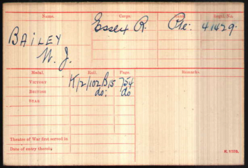 Walter John Bailey was born in Cowlinge [Risbridge Q1-1884 4a:601] to John and Agnes BAILEY (née BANNISTER). 1891 census...Aged 7, he was at Hall Lodge, Hall Road, Cowlinge with his father John BAILEY [33], a farm labourer; his mother Agnes S. [32], and brother JephaThomas [5] and sister Laura Jane. [3]. All the family were born in Cowlinge. 1901 census...Aged 17, a cattle stock man at Sturmer Hall Estate, Sturmer with his father (now horse keeper); mother; brother Jeptha ( now a carter on farm), and sister Laura. He married Ellen Eliza SIZER [26-4-1884] from Sturmer in Q1-1911. 1911 census...Aged 27, an Ostler, he was at King Edward Road, Newmarket with his wife Ellen Eliza [26], born Sturmer. He was employed as an Ostler at the Crown Hotel. His parents were still in Sturmer, with his widower grandfather William Bannister [76] born Cowlinge. His first two children died soon after birth (Walter Noel 1911 and an un-named daughter in 1913) but they went on to have Leslie Francis [17-5-1914], Walter [26-6-1915] and Brenda [1916]. His widow, later married in 1924, William J PEACOCK and lived in Maltings Row, Sturmer His entry in "Our Exning Heroes" reads Bailey, Walter John "Born 1884 in Cowlinge. Educated in the local school. He was ostler at the Crown Hotel when war broke out, and joined up in 1916. He was only 6 months in training before he was sent to France. He was in the Oppy Wood attack near Arras, and met his death by a shell. |