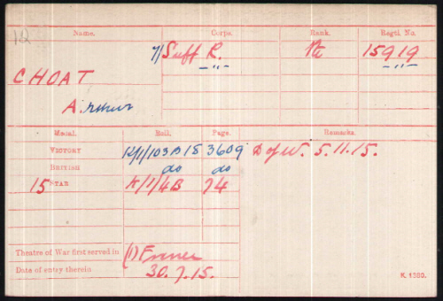 Arthur Choate was born in Sturmer [Risbridge Q2-1890 4a:640], son of Walter and Annie CHOATE (née SPARKES).