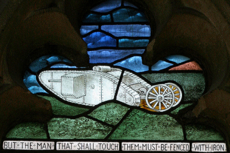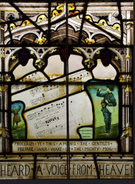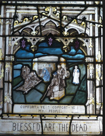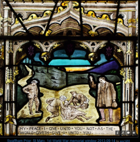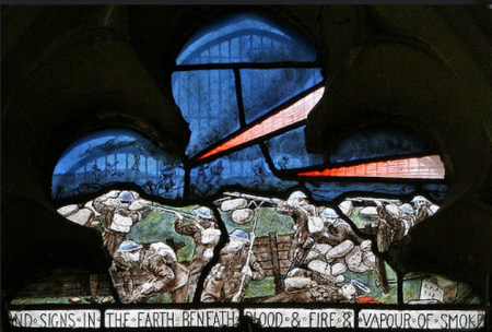 The memorial in St Mary's Church consists of three windows each with two lights. These six lights show scenes from the war, medical care and peace.