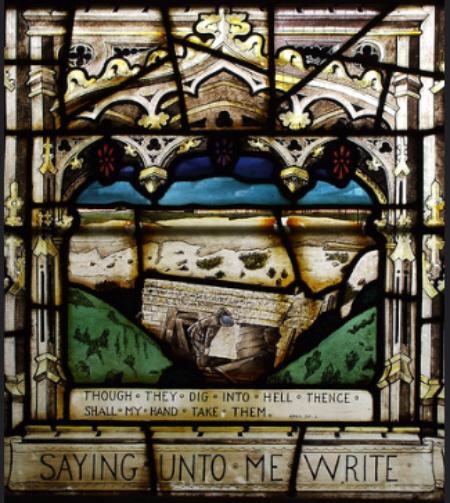 window one, light two bottom (captured dugout) "THOUGH THEY DIG INTO HELL THENCE SHALL MY HAND TAKE THEM"