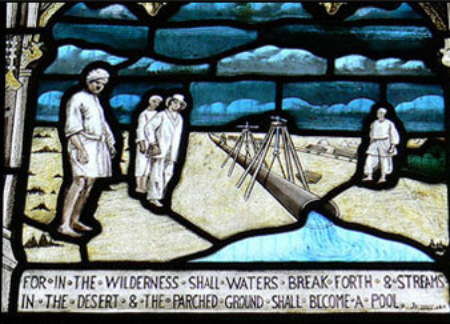 window two, light 1 centre (desert pipeline) "FOR IN THE WILDERNESS SHALL WATERS BREAK FORTH & STREAMS IN THE DESERT & PARCHED GROUND SHALL BECOME A POOL "