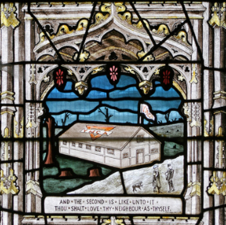 window two, light 1 top (YMCA hut) "AND THE SECOND IS LIKE UNTO IT THOU SHALT LOVE THY NEIGHBOUR AS THYSELF "
