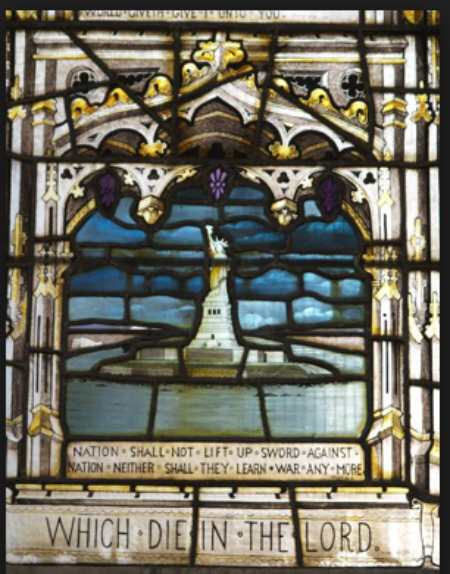 window two, light two bottom (Liberty) "NATION SHALL NOT LIFT UP SWORD AGAINST NATION NEITHER SHALL THEY LEARN WAR ANY MORE"