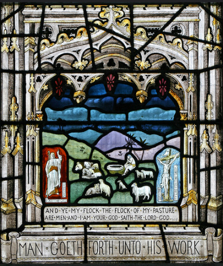 window three, light one, bottom (Christ-shepherds) "AND YE MY FLOCK THE FLOCK OF MY PASTURE ARE MEN AND I AM YOUR GOD SAITH THE LORD GOD"