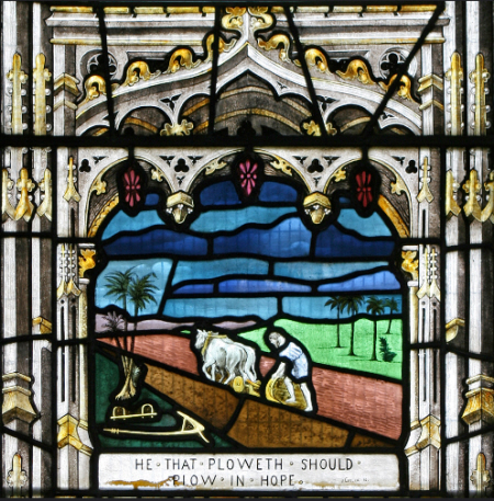 window three, light one centre (ploughing) "HE THAT PLOWETH SHOULD PLOW IN HOPE"