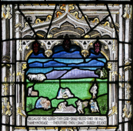 window three, light one, top (rural scenes) "BECAUSE THE LORD THY GOD SHALL BLESS THEE IN ALL THINE INCREASE THEREFORE THOU SHALT SURELY REJOICE"
