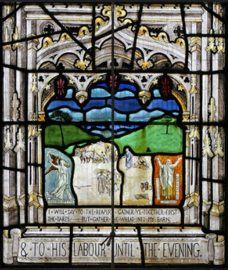 window three, light two bottom (harvest) "I WILL SAY TO THE REAPER GATHER YE TOGETHER FIRST THE TARES BUT GATHER THE WHEAT INTO MY BARN"