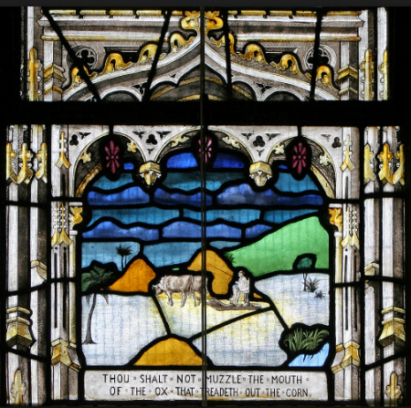 window three, light two centre (oxen THRESHING) "THOU SHALT NOT MUZZLE THE MOUTH OF THE OX THAT TREADETH OUT THE CORN "