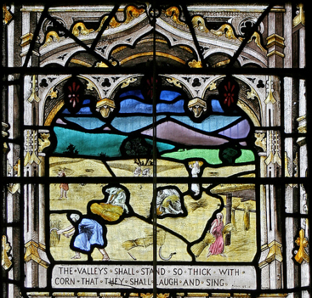 window three, light two top (reaping) "THE VALLEYS SHALL STAND SO THICK WITH CORN THAT THEY SHALL LAUGH AND SING"