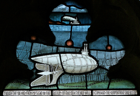 window two top left (U-boat minelayer) "THOUGH THEY BE HID FROM MY SIGHT IN THE BOTTOM OF THE SEA THENCE WILL I COMMAND THE SERPENT & HE SHALL BITE THEM"